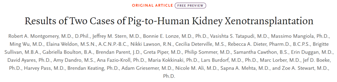 2022年5月19日,来自纽约大学朗格尼移植研究所(Langone Transplant Institute)的Robert A. Montgomery教授等人报告了两例基因编辑猪的肾脏移植病例,研究结果于《新英格兰医学杂志》(NEJM)重磅发表。