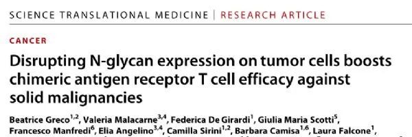 Beatrice Greco et al. Disrupting N-glycan expression on tumor cells boosts chimeric antigen receptor T cell efficacy against solid malignancies. Sci Transl Med. 2022 Jan 19;14(628): eabg3072. doi: 10.1126/scitranslmed. abg3072.
