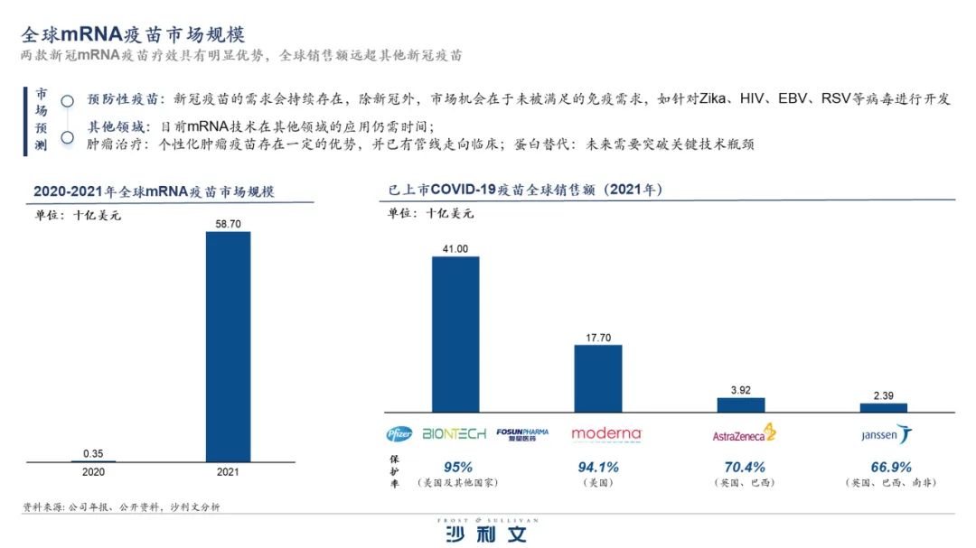 mRNA疫苗为通用的平台型技术,提供了灵活的、快速的、大规模的、具有成本效益的生产流程,面对新冠大流行威胁时,优势明显。与此同时,根据III期临床结果,mRNA新冠疫苗表现出了优于其他新冠疫苗的保护效力和对免疫系统的激活能力。