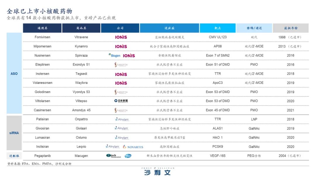 目前,全球共有14款小核酸药物获批上市(早期3款药物已退市),包括9款ASO药物、4款siRNA药物和1款核酸适配体。