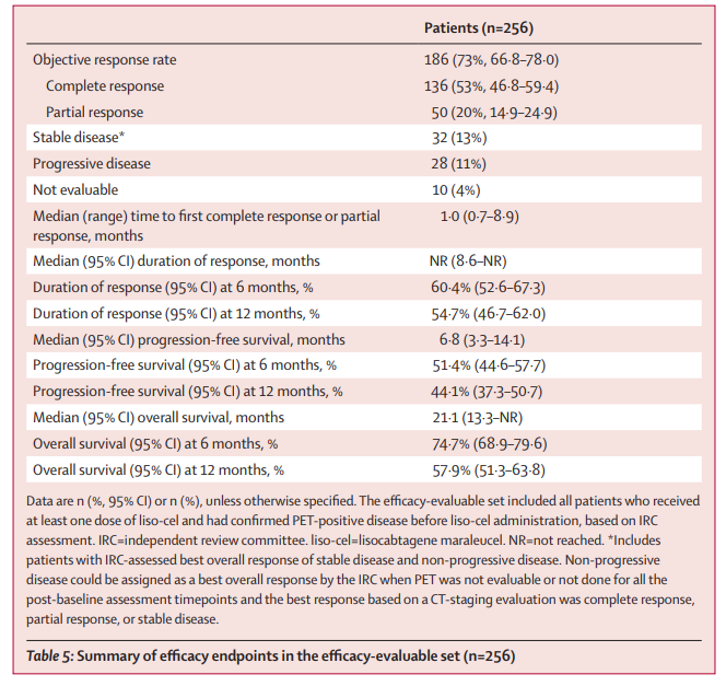 Breyanzi的批准是基于一项TRANSCEND NHL 001临床试验,该研究在评估了超过250名患难治性或复发的大B细胞淋巴瘤患者。结果发现,使用单剂量Breyanzi治疗后的总缓解率(ORR)为73%、完全缓解率(CR)为54%,中位无进展生存期(PFS)为6.8个月、中位总生存期(OS)为21.1个月。病情获得完全缓解的患者中,中位PFS和OS尚未达到,在12个月时,有65.1%的患者病情没有进展、有85.5%的患者存活。