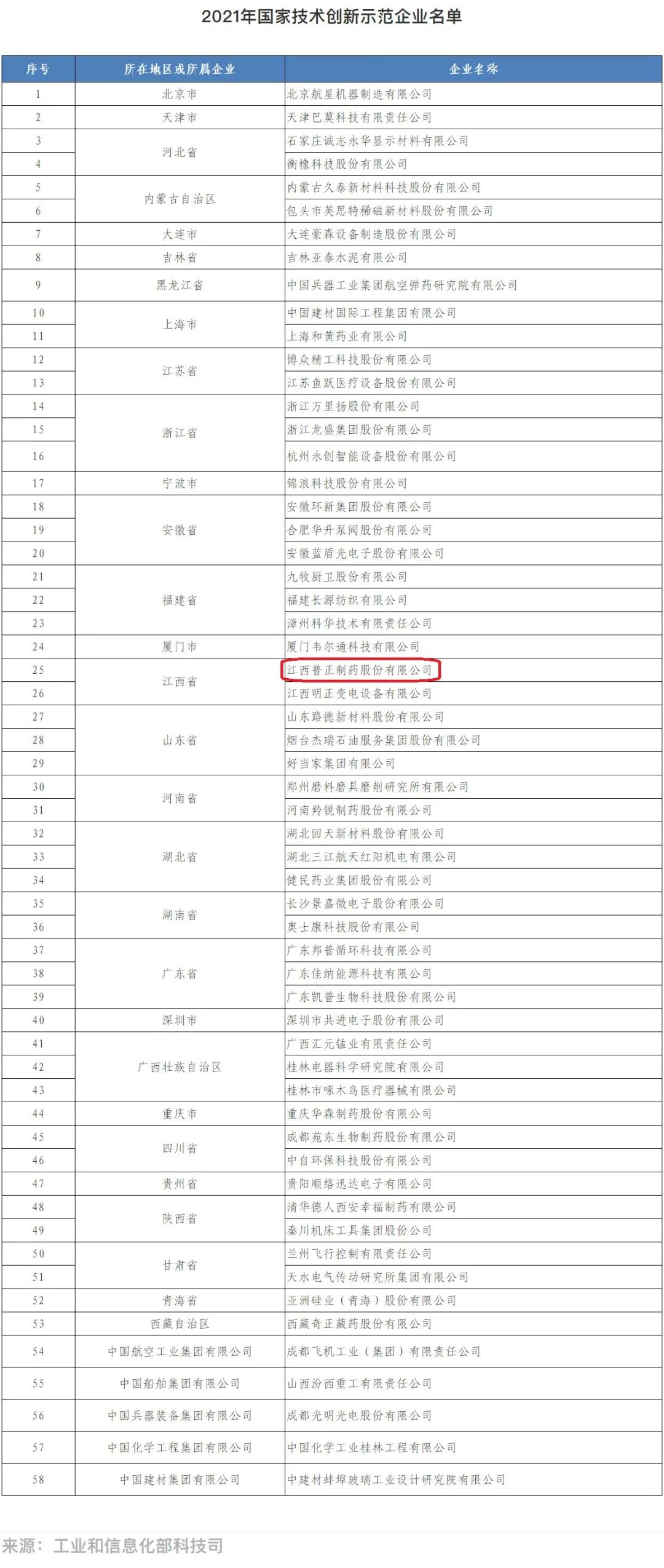 近日,国家工业和信息化部印发了《关于公布2021年国家技术创新示范企业名单的通知》(工信部科函〔2021〕298号),认定了58家企业为2021年国家技术创新示范企业,江西普正制药股份有限公司上榜。