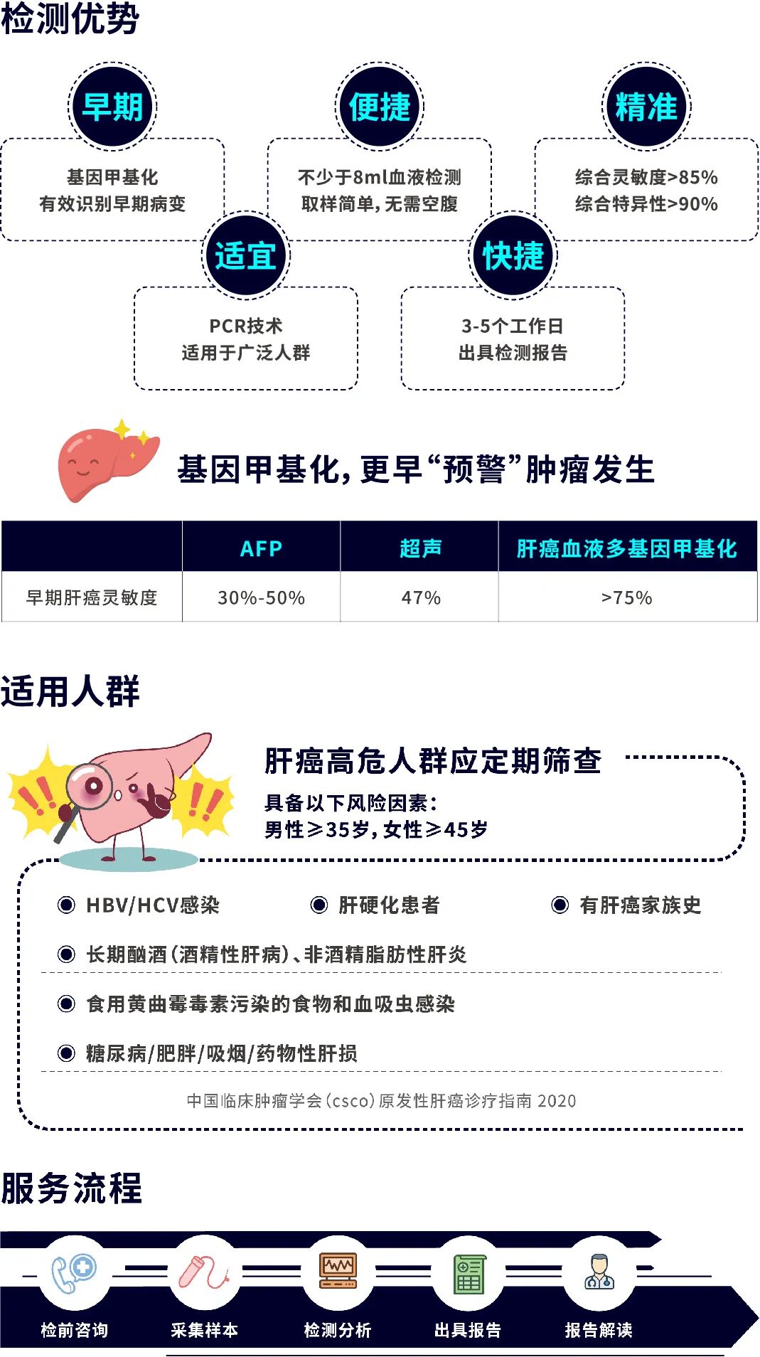 肝癌多基因甲基化检测技术是鹍远生物通过自主研发的MONOD®基因组筛选方法和mTitan®靶向甲基化测序技术,通过数千例样本甄选出最优的肝癌特异性甲基化区域。然后,基于mGuard®技术,高效捕捉和放大血液中微量的肝癌相关基因甲基化信号,精准识别早癌,对肝癌的发生风险予以示警。