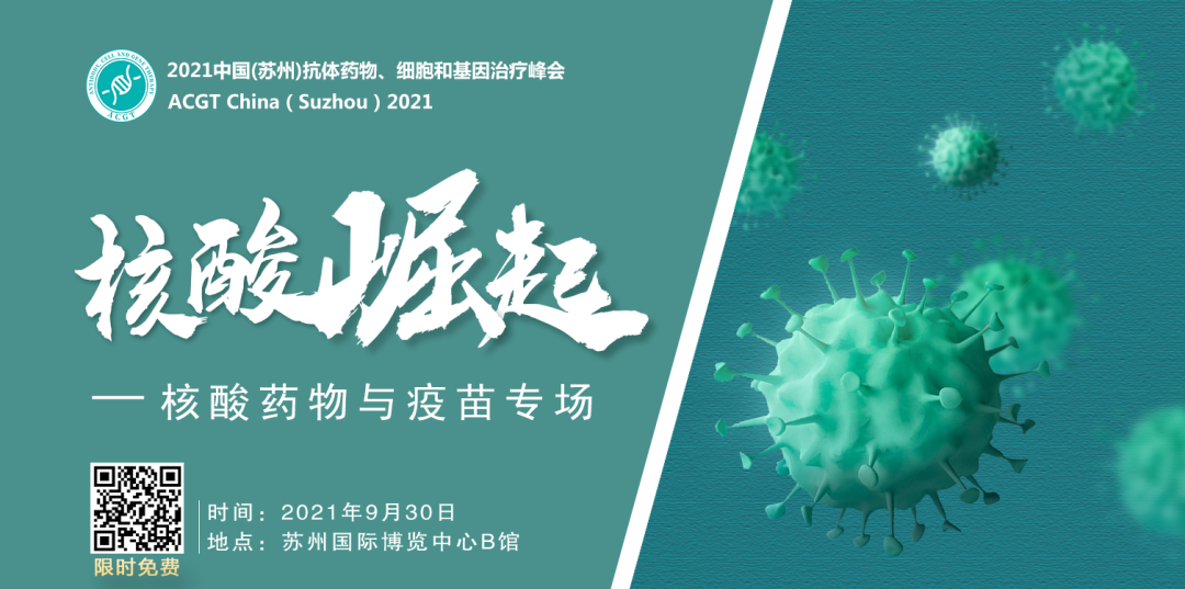 ACGT China主办方:药融圈、Chemenu®、新华日报社苏州分社、青松会、和元生物及佰傲谷,联合举办“2021中国(苏州)抗体药物、细胞和基因治疗峰会”ACGT China (Suzhou) 2021,特邀高校学者以及产业大咖,围绕“单抗、双抗、ADC药物、PDC药物、rDNA药物、疫苗和mRNA技术、Car-T疗法等”领域的前沿进展、工艺技术、法规政策等进行深度解读。