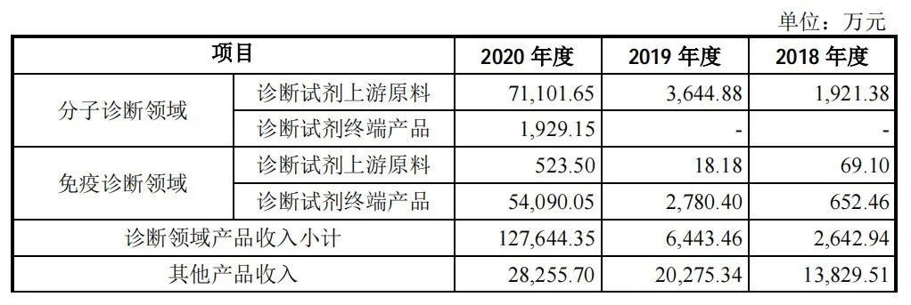 2018年-2019年,公司营业收入总额分别为 1.7亿元、2.68亿元。2020 年,由于新冠疫情在全球范围内爆发,公司生产的新冠检测试剂盒以及作为新冠检测试剂生产原料的生物试剂的市场需求迅速扩大,导致公司经营业绩大幅增加,主营业务收入为15.59亿元。其中,公司新冠疫情相关产品实现销售收入约为 11.8 亿元,约占当期主营业务收入的 76%。