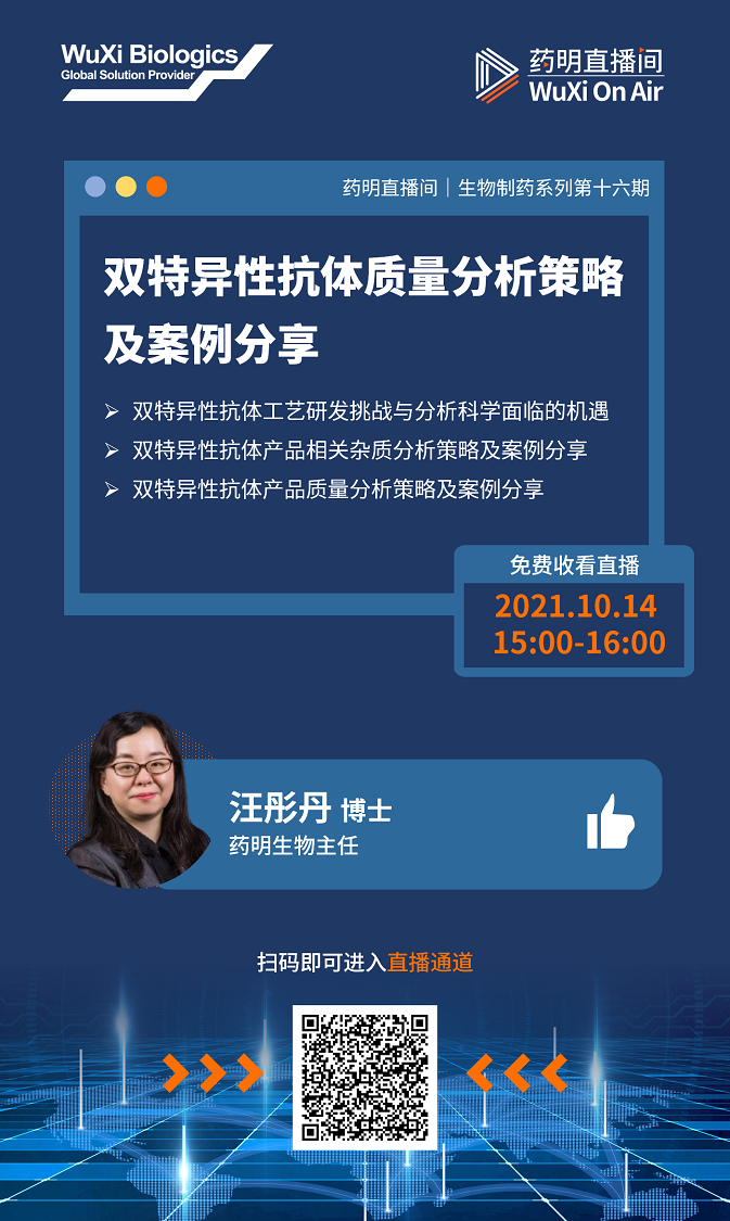 10月14日下午15:00,我们特别邀请了药明生物主任汪彤丹博士做客药明直播间,与大家一同讨论双特异性抗体工艺研发和分析科学所面临的挑战,并通过案例分享应对方法与策略。欢迎大家一同参与!