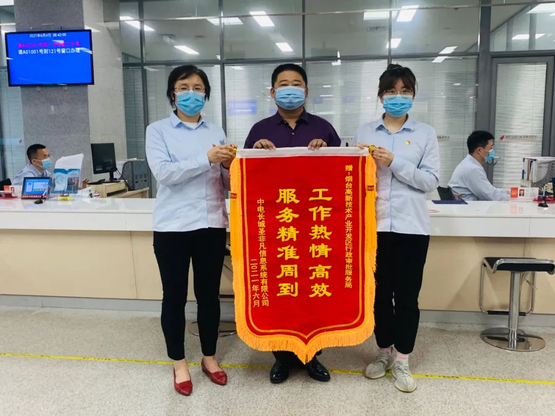 6月4日,中电长城圣非凡信息系统有限公司高新区负责人来到烟台高新区政务服务中心,送上一面印有“工作热情高效服务精准周到”的锦旗,感谢高新区行政审批服务局市场服务科工作人员热情周到的服务,同时感叹道“‘容缺受理’机制真是助力项目落地的‘加速器’”。