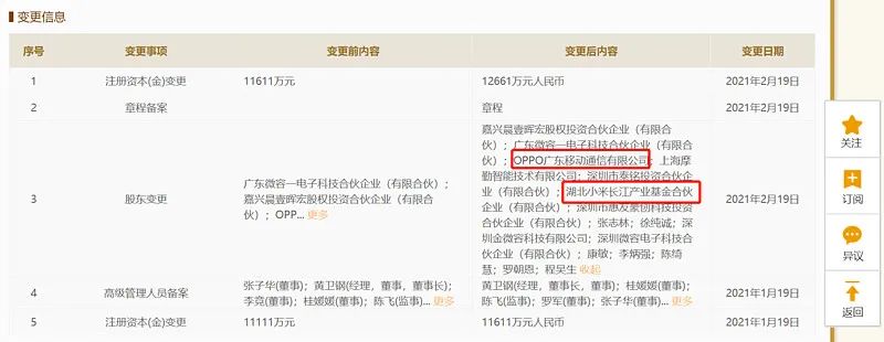 2021年2月19日,广东微容电子科技有限公司(以下简称:微容科技)发生工商变更,新增湖北小米长江产业基金合伙企业(有限合伙)。这是继去年底获得OPPO投资后,微容科技获得的新一轮产业投资。