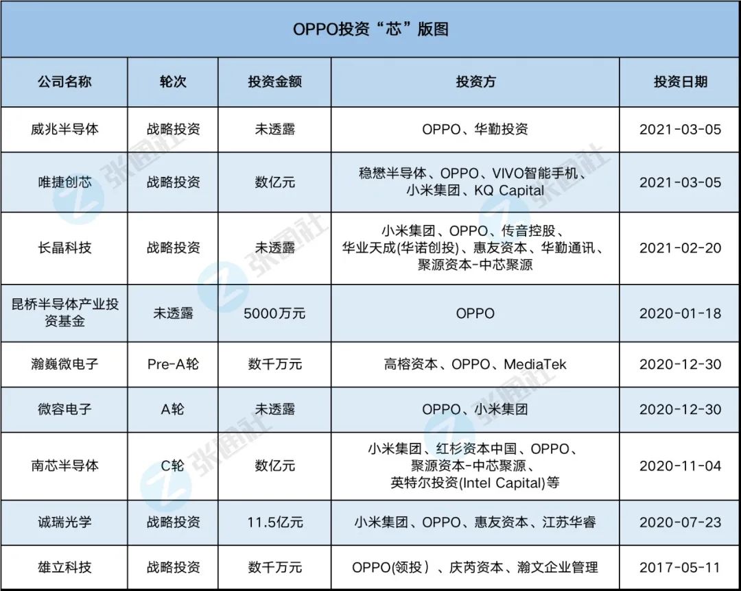 张通社记者梳理发现,自2018年开始,OPPO加快在芯片领域的投资,当年旗下公司上海瑾盛通信经营范围增加集成电路芯片设计。2020年2月,OPPO提出公司在芯片领域的“马里亚纳计划”。此后,OPPO在半导体领域投资加速,先后入股上海南芯半导体、上海瀚巍微电子、广东微容电子、江苏长晶科技等多家半导体公司。2021年1月,OPPO又出资5000万元参股了深圳一只半导体投资基金;2月,OPPO投资半导体企业长晶科技。