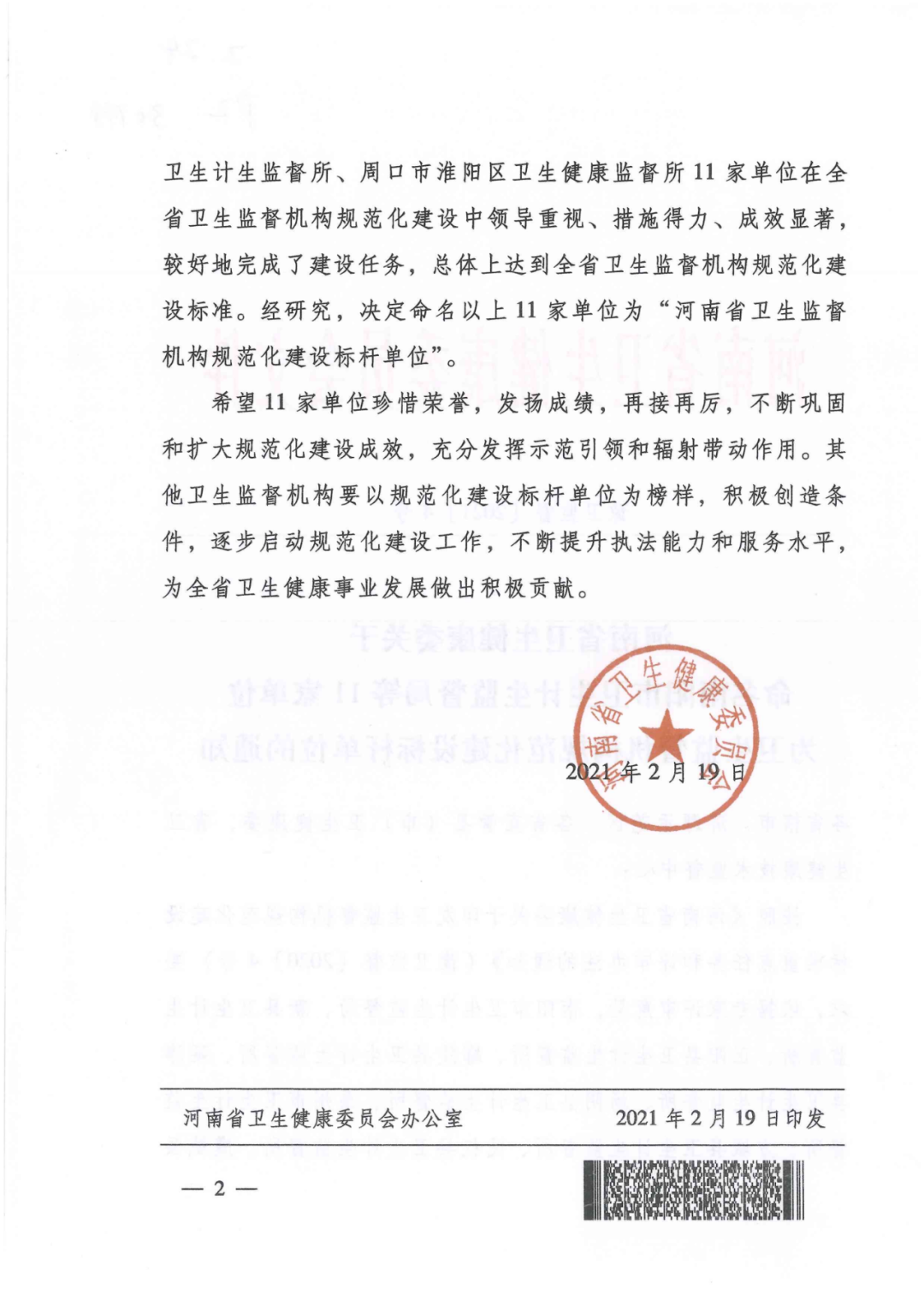 据介绍,按照《河南省卫生健康委关于印发卫生监督机构规范化建设标准重点任务和评审办法的通知》(豫卫监督〔2020〕4号)要求,依据专家评审意见,南阳市卫生计生监督局、新县卫生计生监督所、正阳县卫生计生监督所、鄢陵县卫生计生监督所、延津县卫生计生监督所、汤阴县卫生计生监督所、禹州市卫生计生监督所、方城县卫生计生监督所、民权县卫生计生监督所、虞城县卫生计生监督所、周口市淮阳区卫生健康监督所11家单位在全省卫生监督机构规范化建设中领导重视、措施得力、成效显著,较好地完成了建设任务,总体上达到全省卫生监督机构规范化建设标准。经研究,决定命名以上11家单位为“河南省卫生监督机构规范化建设标杆单位”。