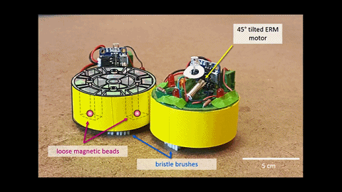 他们创造了一套主动聚集颗粒系统,名为 BOBbots,由许多个直径约 3 公分的小型机器人组成。名字中的 BOB 代表了 Behaving,Organizing,Buzzing,意为行动,组织,嗡嗡的 —— 这些机器人配有振动电机(ERM),光线传感器和磁珠,底盘上还有小刷子,因此行动起来会发出嗡嗡声。