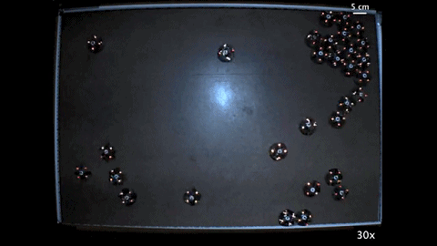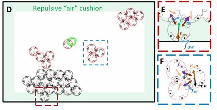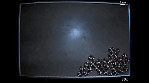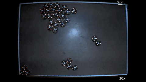 在模拟成团机制的理论算法中,一条很重要的逻辑是 “阻止粒子远离有多个相邻节点的位置”,实际应用到机器人身上,就需要依靠它们内部的小磁球。这些磁铁总是会重新定向以吸引附近的机器人。
