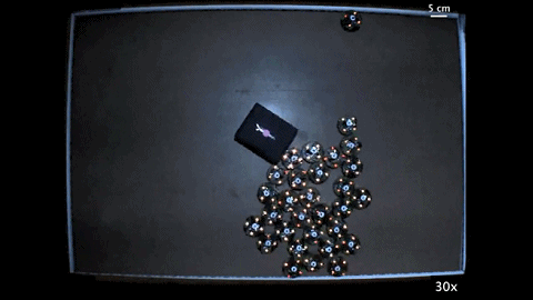 该成果主要和群机器人(swarm robot)相关,如下图,他们研发的集群机器人可以像蚂蚁搬家一样,推动小盒子。
