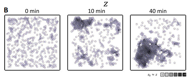 图 | SOPS 算法模拟粒子运动方向的可能性(A);粒子随着时间的推移而逐渐抱团(B)(来源:受访者)