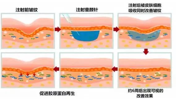 众所周知,皮肤衰老是和胶原蛋白挂钩的,胶原蛋白是皮肤的主要成分。皮肤中胶原蛋白占72%,真皮中80%是胶原蛋白,胶原蛋白在皮肤中构成了一张细密的弹力网,锁住水分,如支架般支撑着皮肤。而随着年龄的增长胶原蛋白流失导致脸颊松弛下垂、苹果肌下移、法令纹显现,童颜针即通过刺激自身胶原蛋白增生补充大量流失了的骨胶原,填补凹陷的部位,改善由浅至深的面部皱纹来达到抗衰及防衰的作用,且较于透透明质酸钠(即玻尿酸)只是单纯的填充,“童颜针”可以募集巨噬细胞、成纤维细胞以及刺激胶原的产生,触感更加自然。