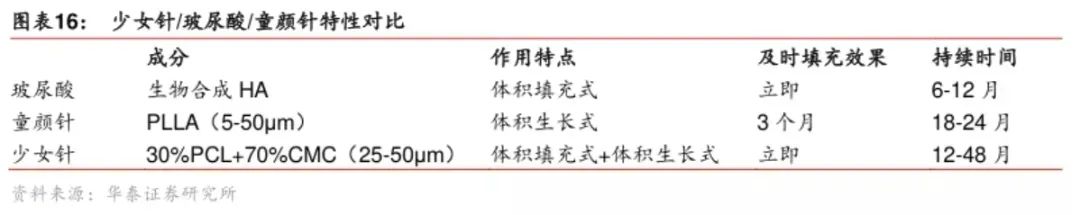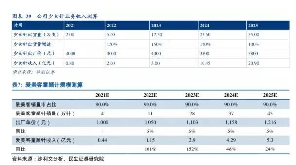 由于同样是长效注射剂且效用相近,这也意味着除了长春圣博玛的产品,爱美的“童颜针”还将与华东医药的“少女针”迎来角逐,此前,已有国内券商研究机构对于华东医药少女针和爱美客童颜针的收入规模进行了测算。