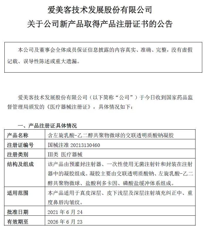 日前,爱美客发布公告称,公司旗下产品“左旋乳酸-乙二醇共聚物微球的交联透明质酸钠凝胶”即俗称的“童颜针”已获得由国家药监局颁发的三类医疗器械注册证,获批上市,主要用于真皮深层、皮下浅层及深层注射填充纠正中及重度鼻唇沟皱纹,这也是继长春圣博玛的“聚乳酸面部填充剂”后(该产品于今年4月获批,也是三类械字号),国内获批的第二款“童颜针”产品。