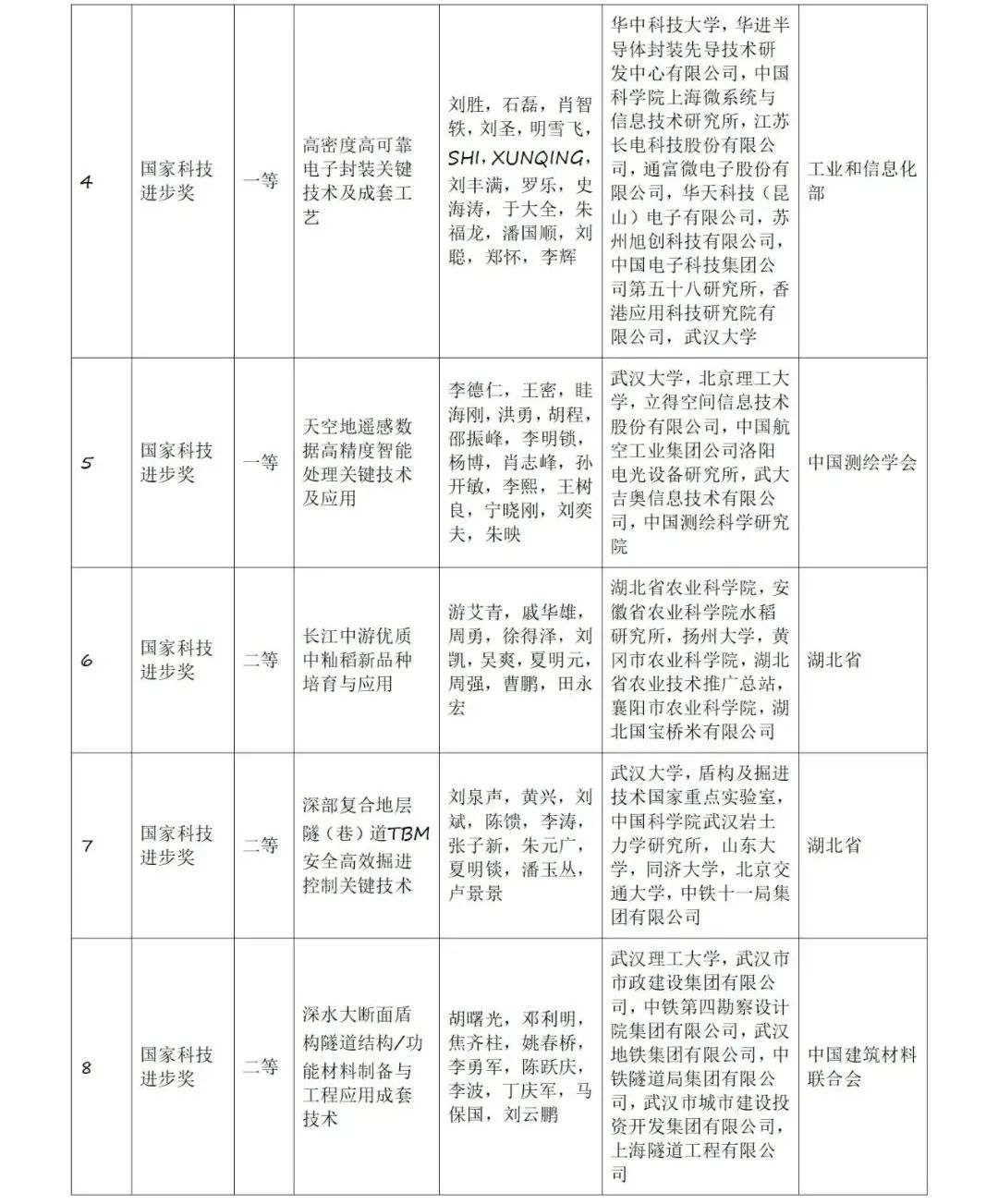 此外,武汉大学刘泉声教授团队主持完成的“深部复合地层隧(巷)道TBM安全高效掘进控制关键技术”、武汉理工大学胡曙光教授团队主持完成的“深水大断面盾构隧道结构/功能材料制备与工程应用成套技术”、武汉大学闫利教授团队主持完成的“厘米级型谱化移动测量装备关键技术及规模化工程应用”均获国家科技进步奖二等奖。其中,武汉理工大学胡曙光教授团队的成果已应用于武汉长江隧道等数十座深水大管径隧道工程。