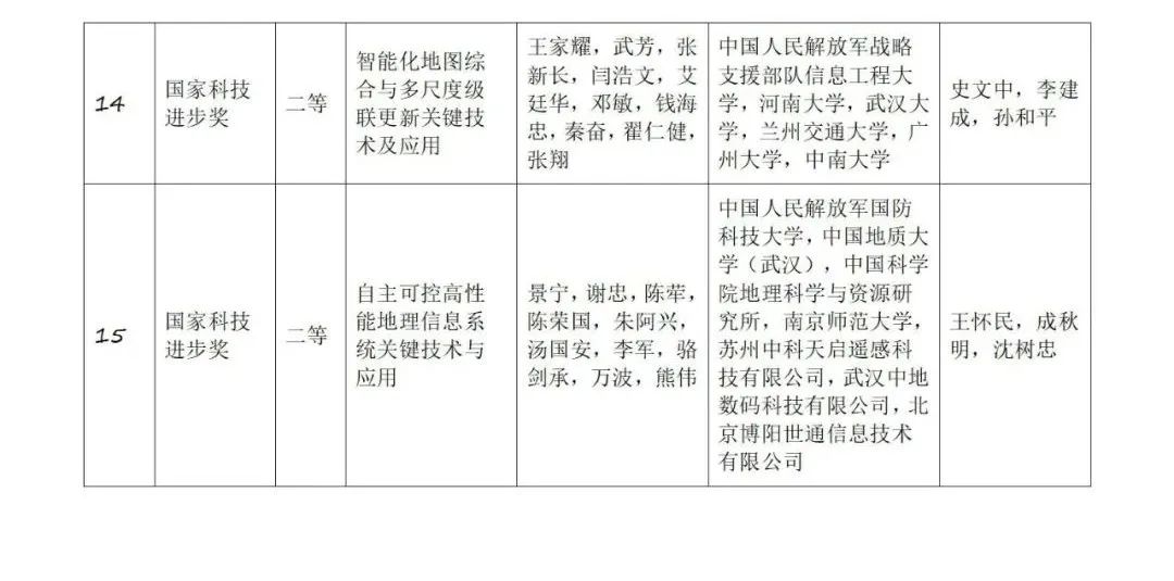 由中国地质大学(武汉)和国防科技大学等单位联合申报的成果《自主可控高性能地理信息系统关键技术与应用》获国家科技进步奖二等奖。地大是该项目的第二完成单位,与国防科技大学等单位持续攻关10年,成果已在我国数百家单位构建了上千套地理空间信息应用系统,近3年直接经济效益6.49亿元。