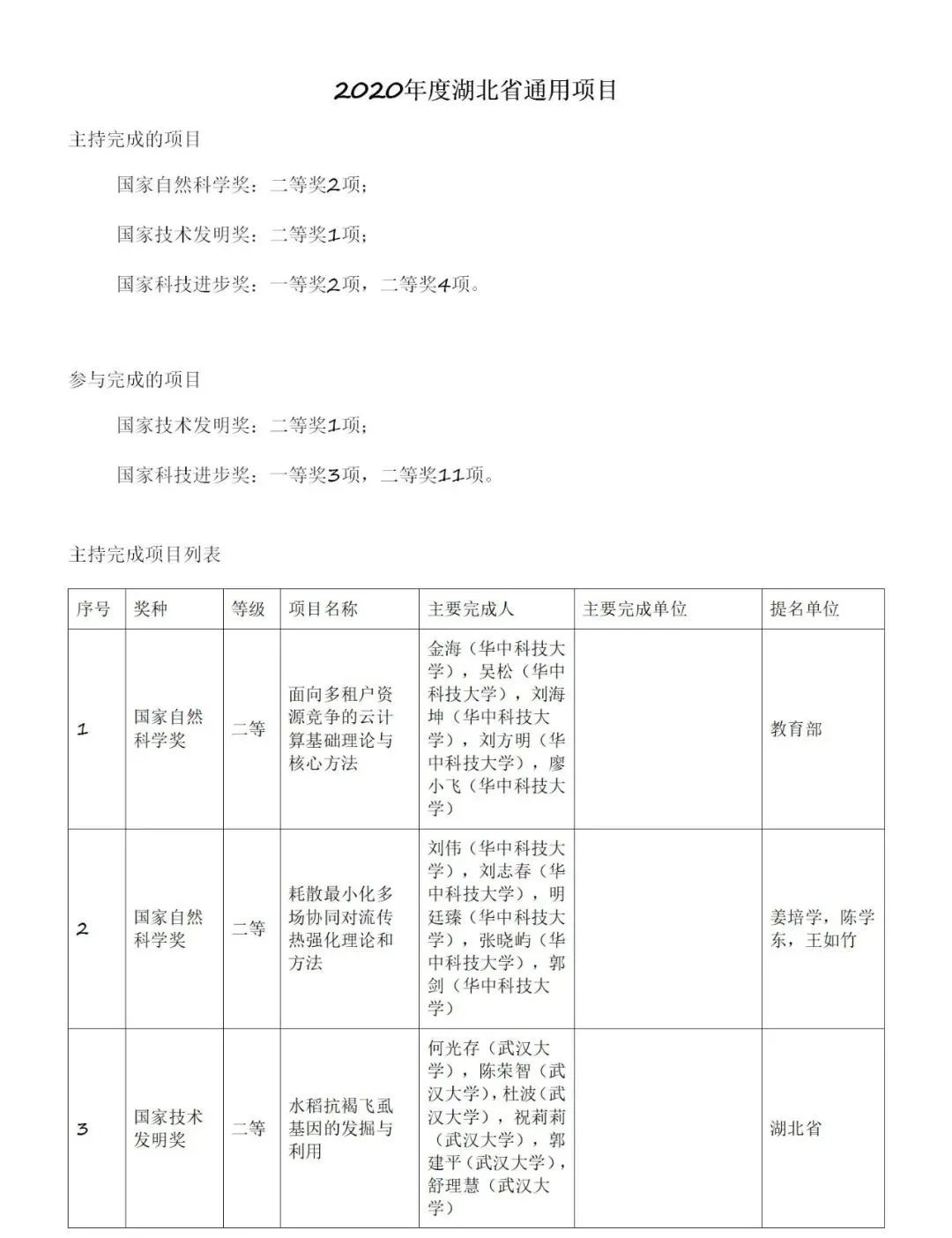 2020年度国家科学技术奖共评选出国家科技进步奖一等奖18项,其中武汉大学、华中科技大学主持项目各有1项获一等奖。武汉大学另有参与完成的成果获国家科技进步奖一等奖1项、二等奖1项。