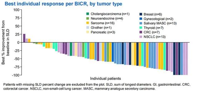 2019年,一款名为Entrectinib(暂译名:恩曲替尼)的靶向NTRK和ROS1融合的TKI类药物被批准上市,经过三项研究综合分析,恩曲替尼在泛瘤种NTRK融合整体疗效可观。