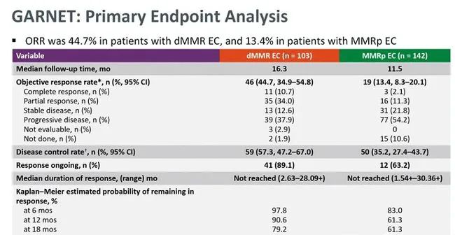 结果显示,所有dMMR 实体瘤(包括子宫内膜和非子宫内膜实体瘤)在接受Dostarlimab治疗后,6个月持续响应率为97.8%,12个月持续响应率为90.6%,18个月持续响应率为79.2%。
