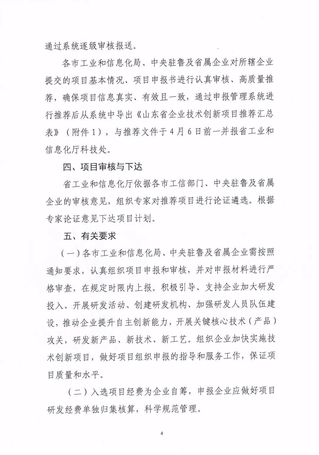 3、请申报企业认真学习省工信厅申报通知要求,按照最新版《山东省企业技术创新项目申报书》格式认真、如实填报相关信息,注意申报时间节点,尽早填写提报,并在审核期内随时关注项目审核状态,如项目被市、区县退回后,及时根据退回意见修改提报。