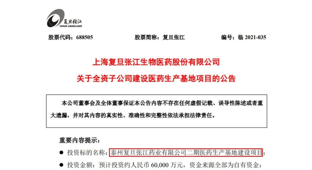 8月12日,复旦张江发布公告,公司全资子公司泰州复旦张江药业有限公司(简称“泰州复旦张江”)作为集团主要的生产基地,为满足本集团后续研发项目的产业化进程,推进现有研发管线申报进度,根据本集团战略规划和经营发展需要,拟投资建设二期医药生产基地项目,该项目包括新建抗体偶联药物车间、固体制剂生产车间、注射剂车间、扩建综合性仓库及配套办公,项目总投资金额为人民币6亿元(其中包含竞拍土地的款项)。
