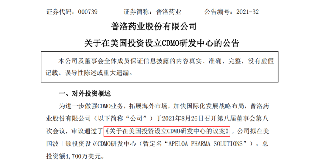8月27日,普洛药业宣布,拟在美国波士顿投资设立CDMO研发中心,总投资额4700万美元。此次拟设立的CDMO研发中心经营范围包括药品研发、制造及销售,药品技术咨询、转让等。此次投资设立海外CDMO研发中心是根据“做强CDMO”发展战略,结合全球创新药发展趋势,为进一步提升公司CDMO研发实力和项目承接能力,更好地为美国及欧洲的创新药客户提供紧密服务,以增强公司CDMO的市场竞争力。