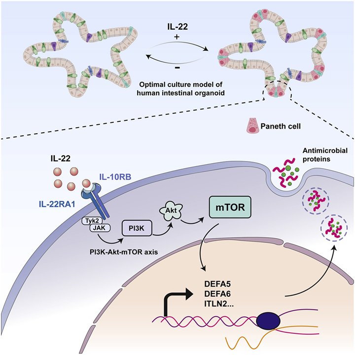 为了诱导人类小肠类器官中潘氏细胞的形成,这些作者研究了多种分子的影响。他们发现,白细胞介素-22(IL-22)增加了潘氏细胞的数量和活性。IL-22对潘氏细胞的影响是令人惊讶的。论文共同第一作者、荷兰皇家艺术与科学学院研究员Gui-Wei He解释了其中的原因:“目前,人们认为IL-22能促进干细胞功能。我们的研究实际上表明,IL-22并没有这样做,而是刺激了潘氏细胞的激活。”因此,这种新发现的IL-22功能被用来增加人类小肠类器官中活跃的潘氏细胞的数量。这导致了模拟健康小肠的类器官的构建。