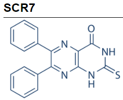 SCR7 是一种特异性 DNA Ligase IV 抑制剂,可阻断非同源性末端连接(NHEJ)。在哺乳动物细胞和小鼠胚胎中,SCR7可增加利用CRISPR/Cas9进行HDR(homology directed repair, 同源介导的双链DNA修复)介导的基因编辑效率,最高可增强至19倍。