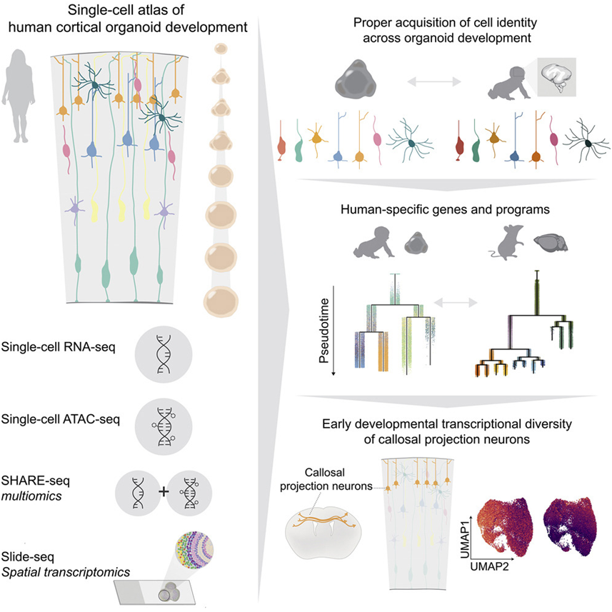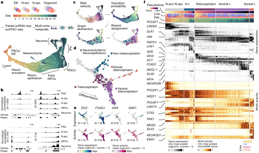 大脑类器官发育的多组学图谱揭示了发育的层次和命运决定的关键阶段。图片来自Nature, 2022, doi:10.1038/s41586-022-05279-8。