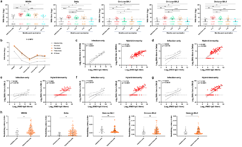 接种新冠疫苗后,康复者RBD-IgG与NP-IgG的滴度提升了3.4至13.2倍,并在接种后的9个月内维持高抗体滴度的状态。同时真病毒中和实验表明,灭活疫苗接种可使新冠康复者获得抵抗德尔塔以及奥密克戎谱系(BA.1,BA.2,BA.5)等多种新冠病毒的广谱免疫力。