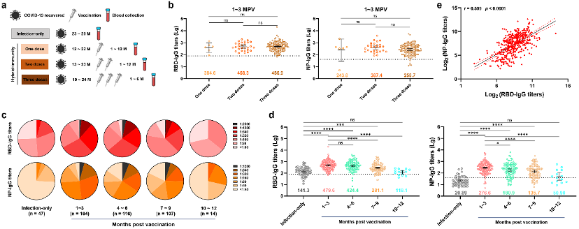 本研究共纳入448例新冠康复者,所有的康复者均没有出现再次感染,其中401例在康复1年或更长的时间后接种了1-3针不等的新冠灭活疫苗。新冠康复者康复2年后,在没有再次抗原暴露的情况下,其新冠特异性抗体RBD-IgG(抗新冠病毒受体结合域抗体)与NP-IgG(抗新冠病毒核衣壳抗体)滴度非常低,甚至无法被检测到。这也导致新冠康复者基本丧失了对新冠突变株,包括德尔塔以及奥密克戎谱系(BA.1,BA.2,BA.5等)的抵抗能力。