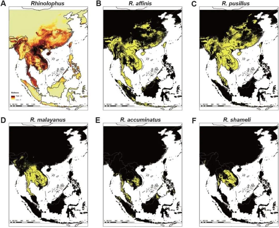 为了更好地了解蝙蝠冠状病毒的生态性,研究人员利用整理的分布数据对亚洲49种菊头蝠的分布进行了建模。生态建模显示,在东南亚和中国南部的大部分地区,菊头蝠的丰富度很高,在分析中包括的49个物种中,预计将有多达23个物种共存。当地气候,特别是影响全年饮食供应的因素,似乎是决定整个地区蝙蝠物种分布的关键。