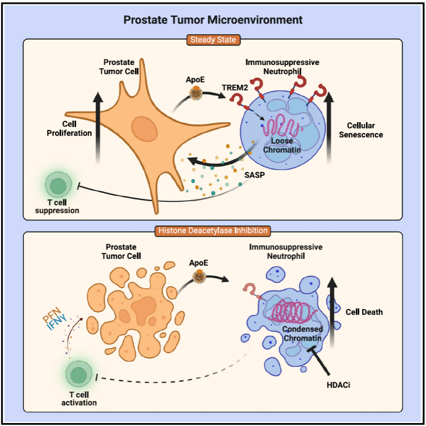 促进TREM2+免疫抑制性中性粒细胞衰老,并且APOE/TREM2轴与前列腺癌患者不良预后相关,用组蛋白去乙酰化酶抑制剂特异性消除衰老的免疫抑制性中性粒细胞可改善治疗效果。由此