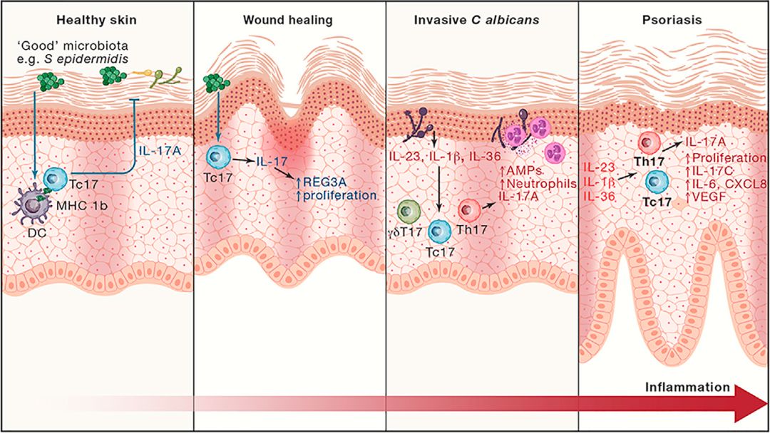银屑病中,IL-17的促炎效应处于持续活化状态,导致角质细胞的过度增生和皮肤炎症。