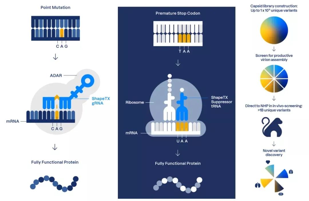 其中,RNAfix是一种gRNA(引导 RNA),通过招募ADAR酶(一种在天然的RNA编辑器)来编辑单个碱基;RNAskip是一种抑制性 tRNA(转运RNA),用于治疗由过早终止突变引起的疾病(即某种氨基酸的密码子突变为终止密码子,导致肽链合成过早终止),可识别过早终止密码子,使翻译通读,产生完全校正的蛋白质;Delivery – AAVid衣壳发现平台能生产具有更优递送特性的AAV载体,可有效地将RNAfix和RNAskip 有效载荷以及其他有效载荷输送到特定组织中。Shape目前尚无公开的管线项目。