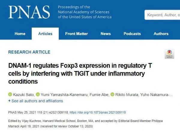 Kazuki Sato, Yumi Yamashita-Kanemaru, Fumie Abe, et al. DNAM-1 regulates Foxp3 expression in regulatory T cells by interfering with TIGIT under inflammatory conditions, PNAS(2021), DOI:10.1073/pnas.2021309118