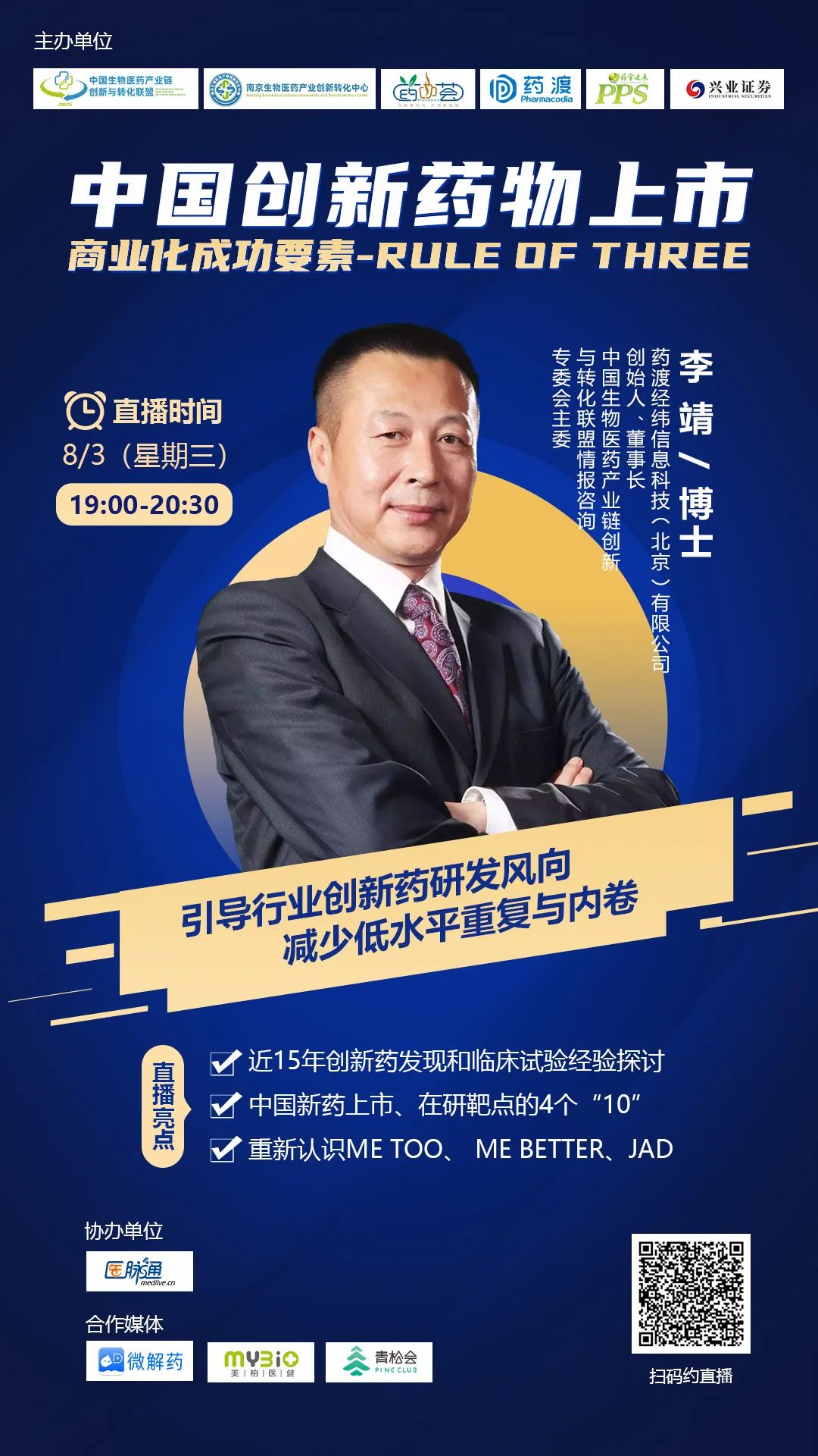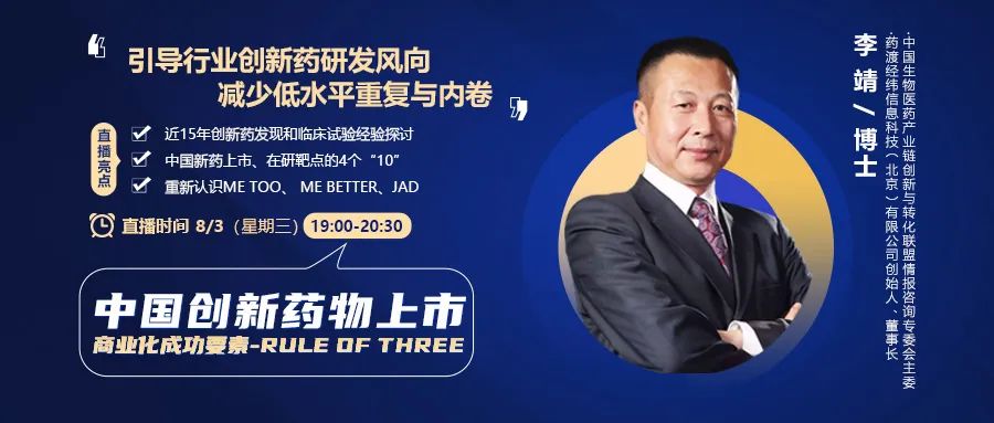 8月3日19:00,由中国生物医药产业链创新与转化联盟情报咨询专委会发起的药咖分享会第18期《中国创新药物上市商业化成功要素——RULE OF THREE》,特邀药渡经纬信息科技(北京)有限公司创始人、董事长李靖博士做客云上直播间。欢迎预约直播,准时收看!