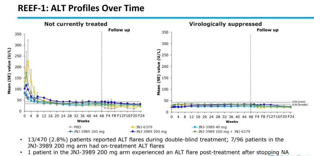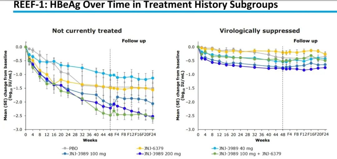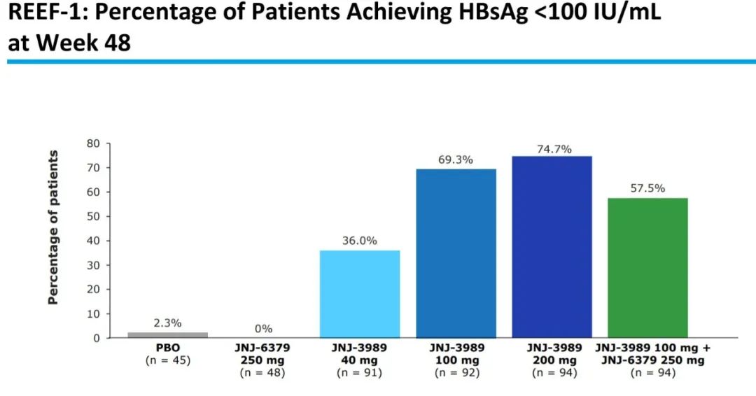 REEF-1(NCT03982186)是一项2b期、多中心、双盲、主动对照、随机研究,旨在评估JNJ-3989每月皮下注射48周(3种剂量水平分别为40、100和200mg)的疗效和安全性和/或对目前未治疗或病毒抑制的HBeAg阳性或阴性慢性乙型肝炎患者每日口服250毫克JNJ-6379联合每日口服NA。患者需要HBsAg水平大于100 IU/mL才能进入研究。所有研究组的平均基线HBsAg水平约为3.7 log10 IU/mL。研究的主要终点是治疗结束时(第48周)符合NA停止标准(ALT低于正常上限的3倍,HBV DNA低于定量下限,HBeAg阴性,HBsAg低于10 IU/mL)的患者比例。
