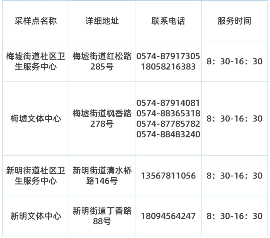 为方便重点地区来我区人群新冠核酸检测,即日起启动梅墟街道社区卫生服务中心,新明街道社区卫生服务中心、梅墟文体中心、新明文体中心核酸采样服务点,相关人员可以就近选择服务点进行采样。
