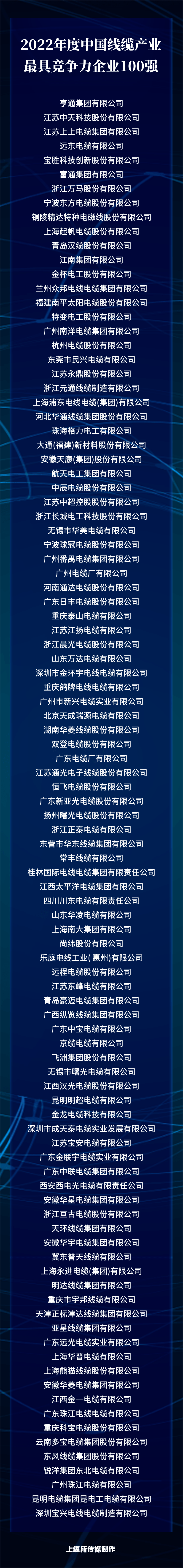 上榜“2022年中国线缆产业最具竞争力企业100强”。