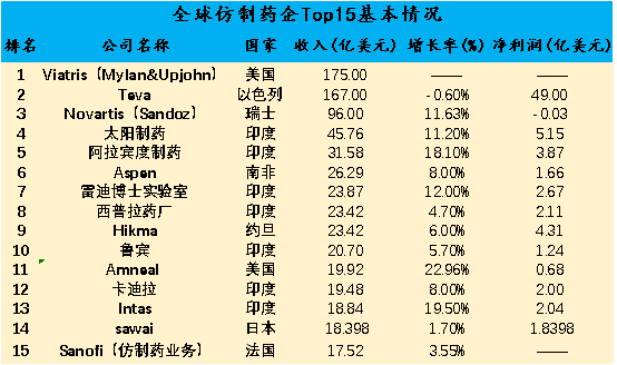 据IMARC集团的最新报告,全球仿制药市场规模在2020年达到3860亿美元,到2026年,市场价值预计将达到5170亿美元,在预测期内(2021-2026)的复合年增长率为4.9%。据我们统计2020年全球仿制药top15销量达到727亿美元左右。