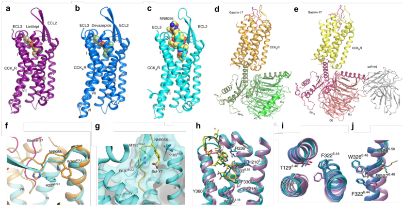 图2. CCKR分别与小分子拮抗剂和多肽激动剂结合的三维结构。
