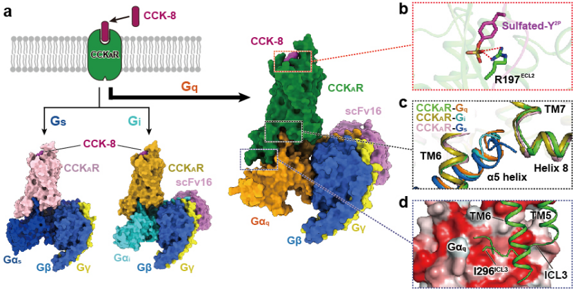 GPCR被配体激活后主要通过偶联细胞内的G蛋白进行信号转导。根据α亚基的不同,G蛋白可分为Gi/o、Gs、Gq/11和G12/13d等四亚家族。虽然目前已经报道了不同GPCR与其下游G蛋白的结合的大量复合物结构,但受体如何精确识别这四种G蛋白一直困扰着科研人员。由于CCKAR能够偶联这四种不同的G蛋白,因而成为研究GPCR与G蛋白选择性结合机制的模式受体。