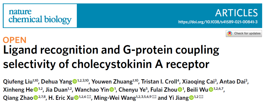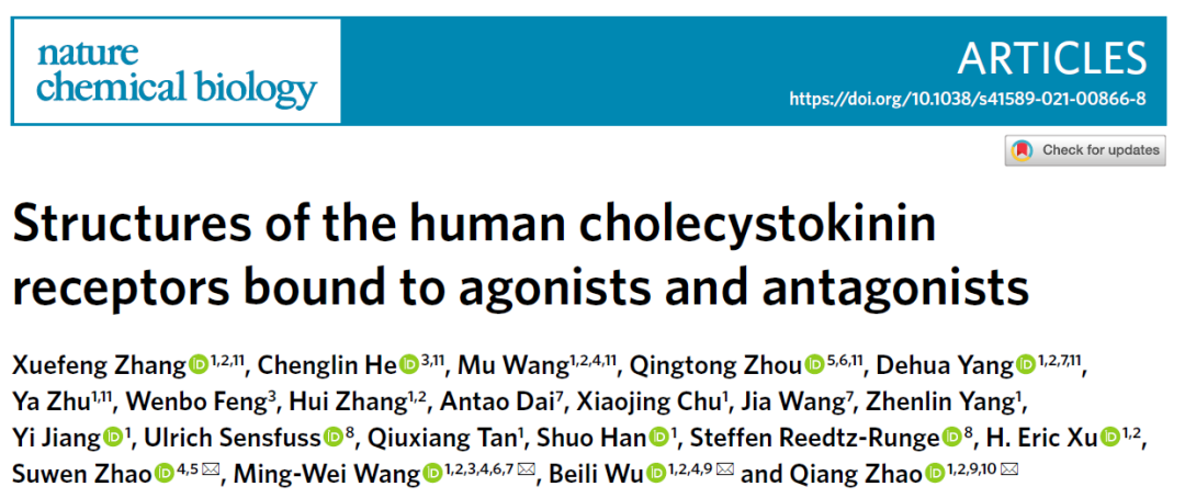 2021年9月23日,中国科学院上海药物研究所蒋轶/徐华强团队、赵强团队、吴蓓丽团队、王明伟/杨德华团队和上海科技大学赵素文团队背靠背于Nature Chemical Biology在线发表了题目分别为 “Ligand recognition and G protein-coupling promiscuity of cholecystokinin A receptor” 和“Structures of the human cholecystokinin receptors bound to agonists and antagonists”的两项研究成果,解析了2种小分子拮抗剂(Devazepide、Lintitript)和激动剂NN9056与A型人源缩胆囊素受体(Cholecystokinin receptor,CCKAAR)结合的3个晶体结构,以及多肽激素CCK-8的CCKAR分别与3种不同G蛋白(Gs、Gi、Gq)偶联复合物和多肽Gastrin-17分别与B型缩胆囊素受体(CCKBR)和两种G蛋白(Gi、Gq)形成复合物的5个冷冻电镜结构。他们系统性地揭示了多种多肽和小分子配体特异性识别缩胆囊素受体亚型的结构基础,阐明了配体选择性和受体活化的分子机制,破解了CCKAR选择性偶联不同G蛋白的生命奥秘,从而为靶向该类受体的药物研发提供了重要信息。