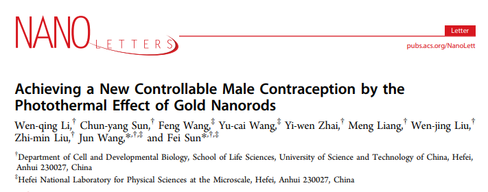2013年,中国科学技术大学生命科学学院(现单位是江苏南通大学医学院)孙斐教授团队率先报道了利用金纳米棒的光热效应抑制精子发生实现雄性可控避孕的研究(Nano Lett. 2013, 13, 6, 2477–2484),在国际上首次提出“纳米避孕”的概念,并被《Nature Material》专题评论重点报道。在该研究中,研究人员通过近红外 (NIR) 照射在睾丸原位注射金纳米棒实现了可控的男性避孕,随后,在学术界掀起了利用各种纳米材料的光热活性,通过睾丸注射给药的避孕研究热潮。