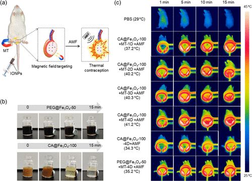 图 3. (a) 通过静脉给药对小鼠模型进行无创避孕治疗的示意图。(b) 分别在 0、3、10 和 15 分钟时显示 IONP 磁捕获的照片。(c) 在输出电流为 30 A 的 AMF (403 kHz) 下不同时间间隔处理小鼠的热红外图像。