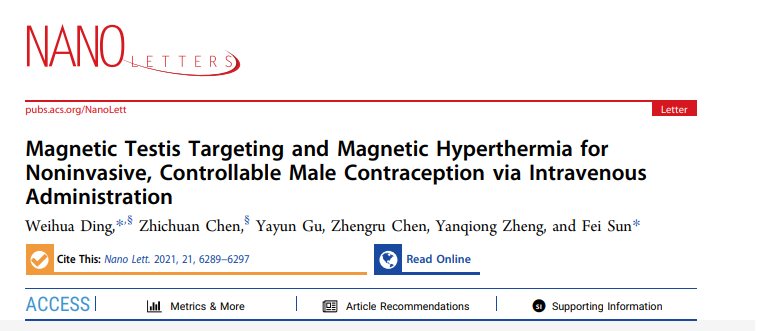 研究论文题为“Magnetic Testis Targeting and Magnetic Hyperthermia for Noninvasive, Controllable Male Contraception via Intravenous Administration”,发表在国际顶级期刊《Nano Letters》上。江苏南通大学医学院学院青年教师丁伟华博士和博士生陈志川为共同第一作者;孙斐教授和丁伟华博士为共同通讯作者。